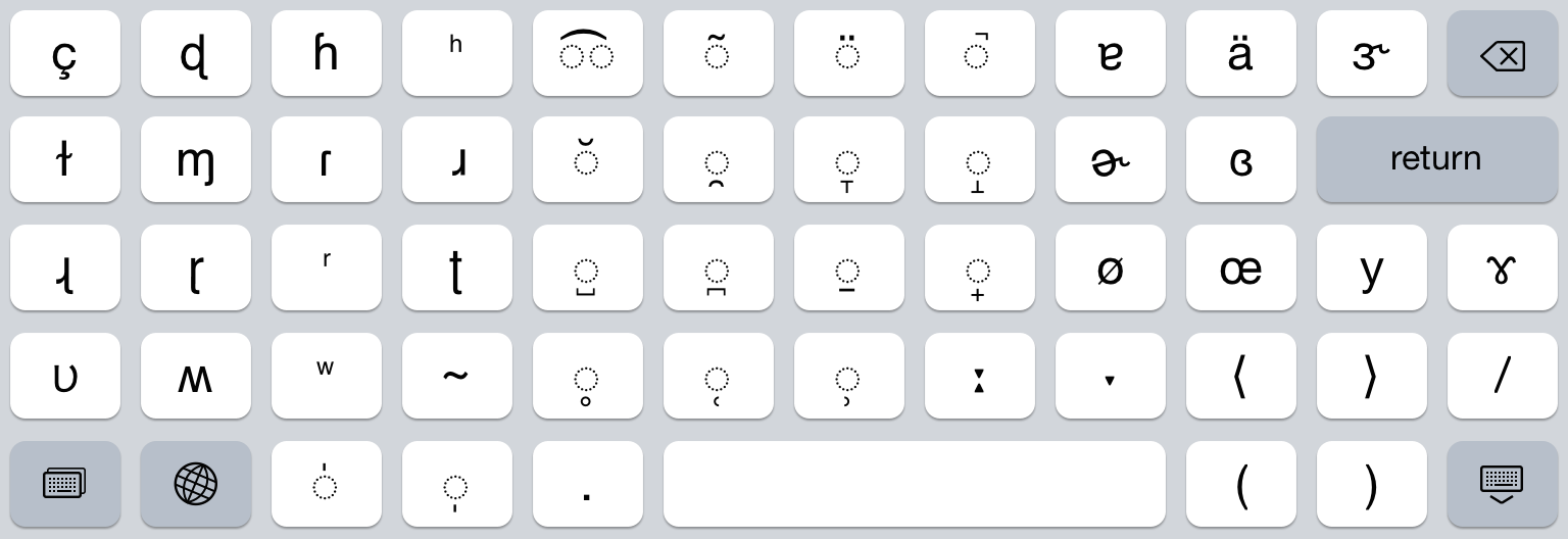 The keyboard for iPad has two layers: a primary layer optimized for common English following the conventions used in Wikipedia, and a second layer supporting the detailed representation of regional variants.